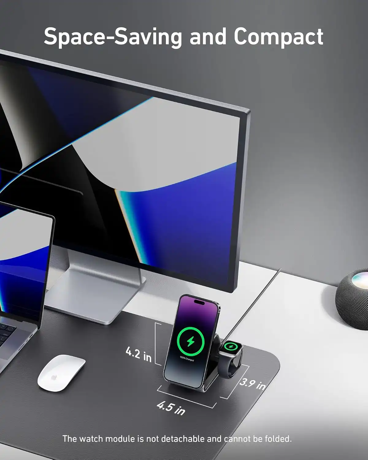 این یعنی سرعت شارژ این دستگاه دقیقاً برابر با شارژرهای سیمدار استاندارد یا شارژر مگسیف خود شرکت اپل است. با استفاده از این قابلیت، شما میتوانید درصد قابل توجهی از باتری آیفون خود را در مدت زمان کوتاهی شارژ کنید. علاوه بر آیفون، ماژول شارژ اپل واچ نیز از قابلیت Fast Charging برای سریهای جدید اپل واچ (مانند سری ۷، ۸، ۹ و اولترا) پشتیبانی میکند که میتواند ساعت شما را در کمتر از ۴۵ دقیقه از ۰ به ۸۰ درصد برساند. ترکیب این سرعت با راحتی استفاده بیسیم، تجربه کاربری بینظیری را رقم میزند.