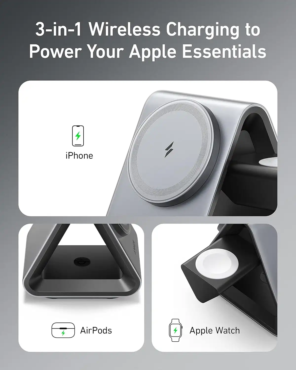 در بخش جلویی، پد مگسیف برای آیفون قرار دارد که با قدرت مغناطیسی بالا گوشی را نگه میدارد. در بخش کناری، ماژول شارژ سریع اپل واچ تعبیه شده و در فضای پنهانِ وسط مثلث، جایگاهی برای شارژ بیسیم کیس ایرپاد در نظر گرفته شده است. این یعنی شما تنها با اتصال یک کابل به برق، یک نیروگاه کوچک روی میز خود دارید که میتواند انرژی مورد نیاز تمام گجتهای روزمره شما را بهصورت همزمان و بدون افت توان تامین کند. این ویژگی برای کسانی که به مینیمالیسم و نظم اهمیت میدهند، یک موهبت بزرگ محسوب میشود.